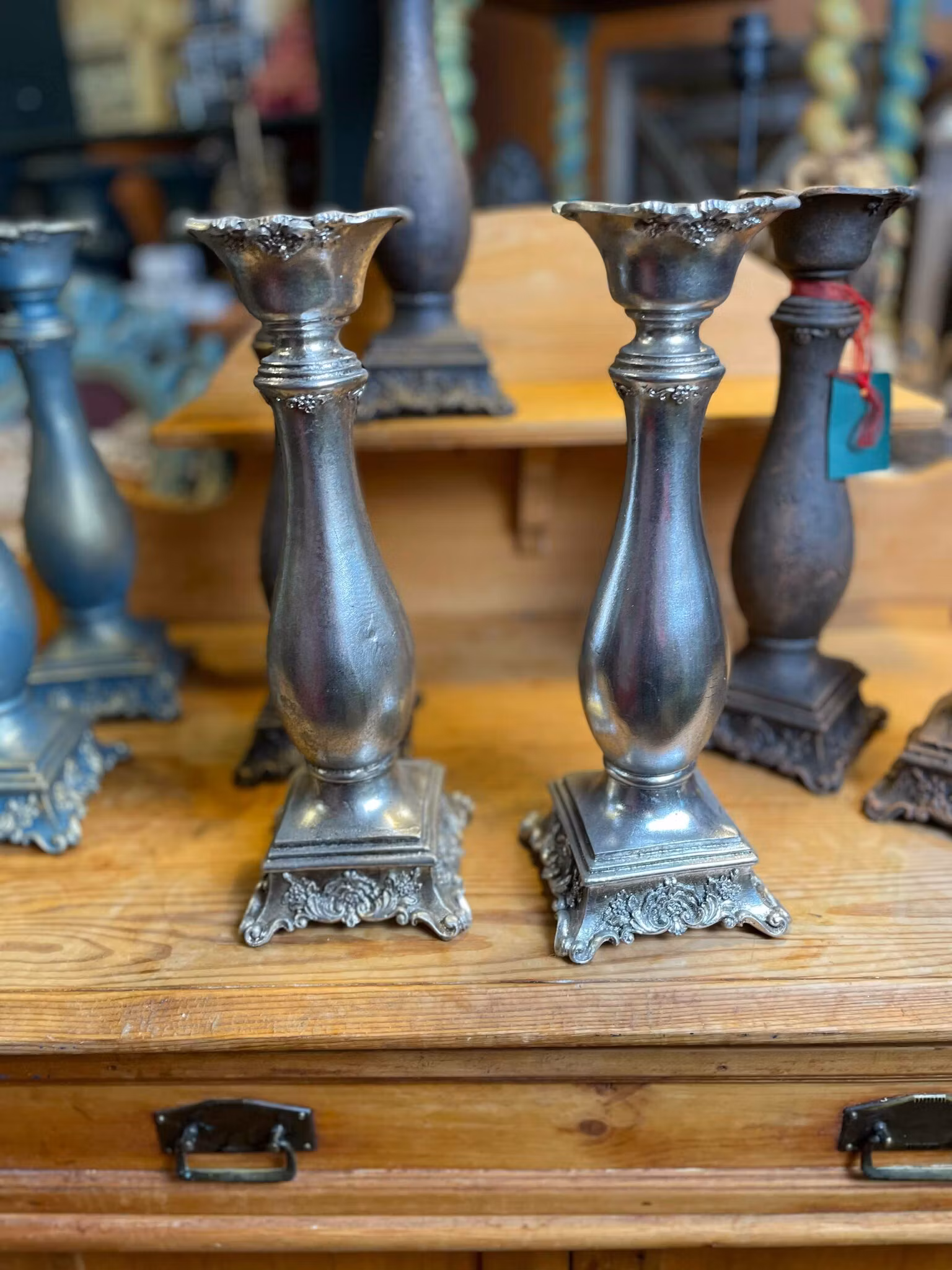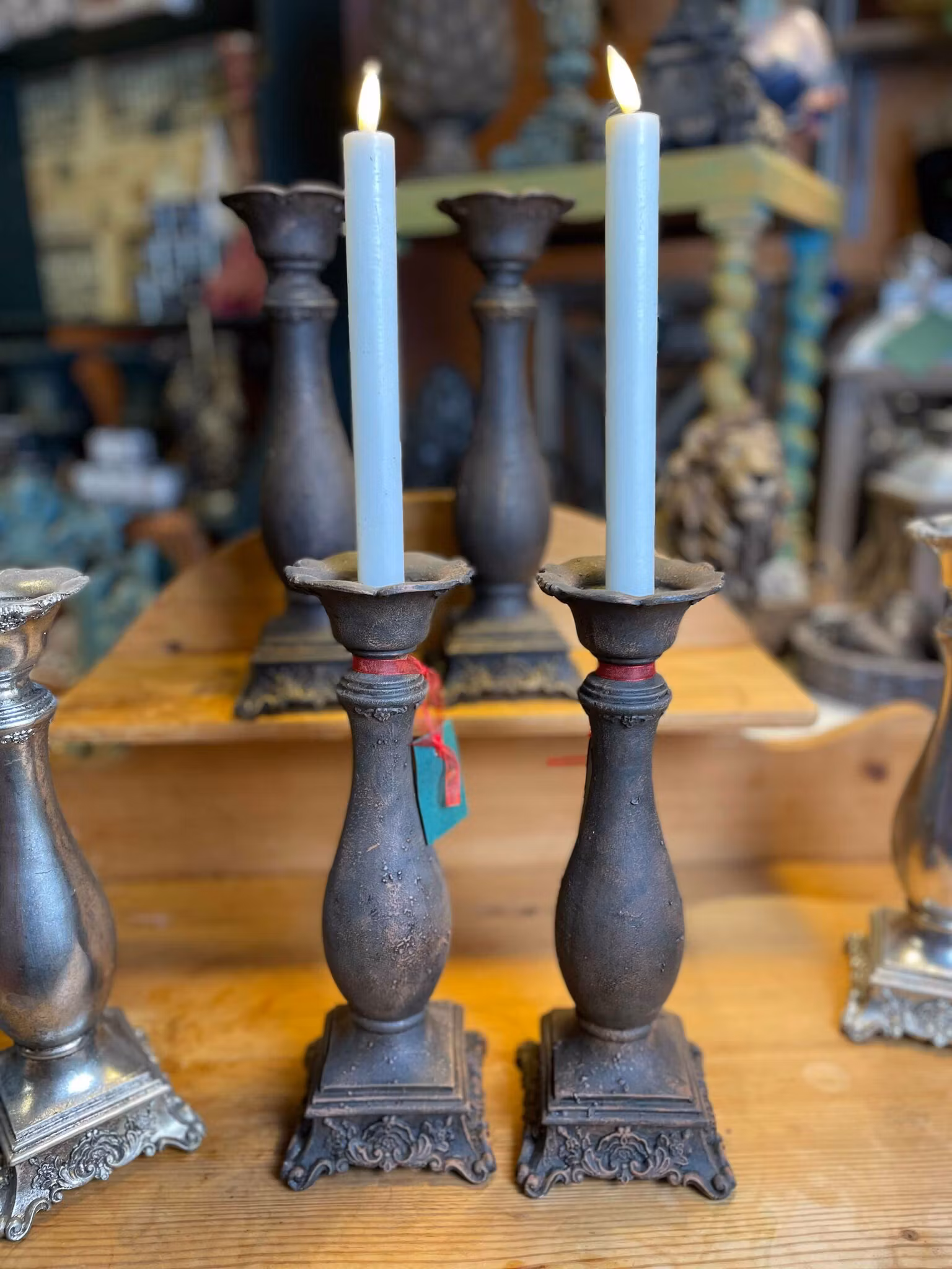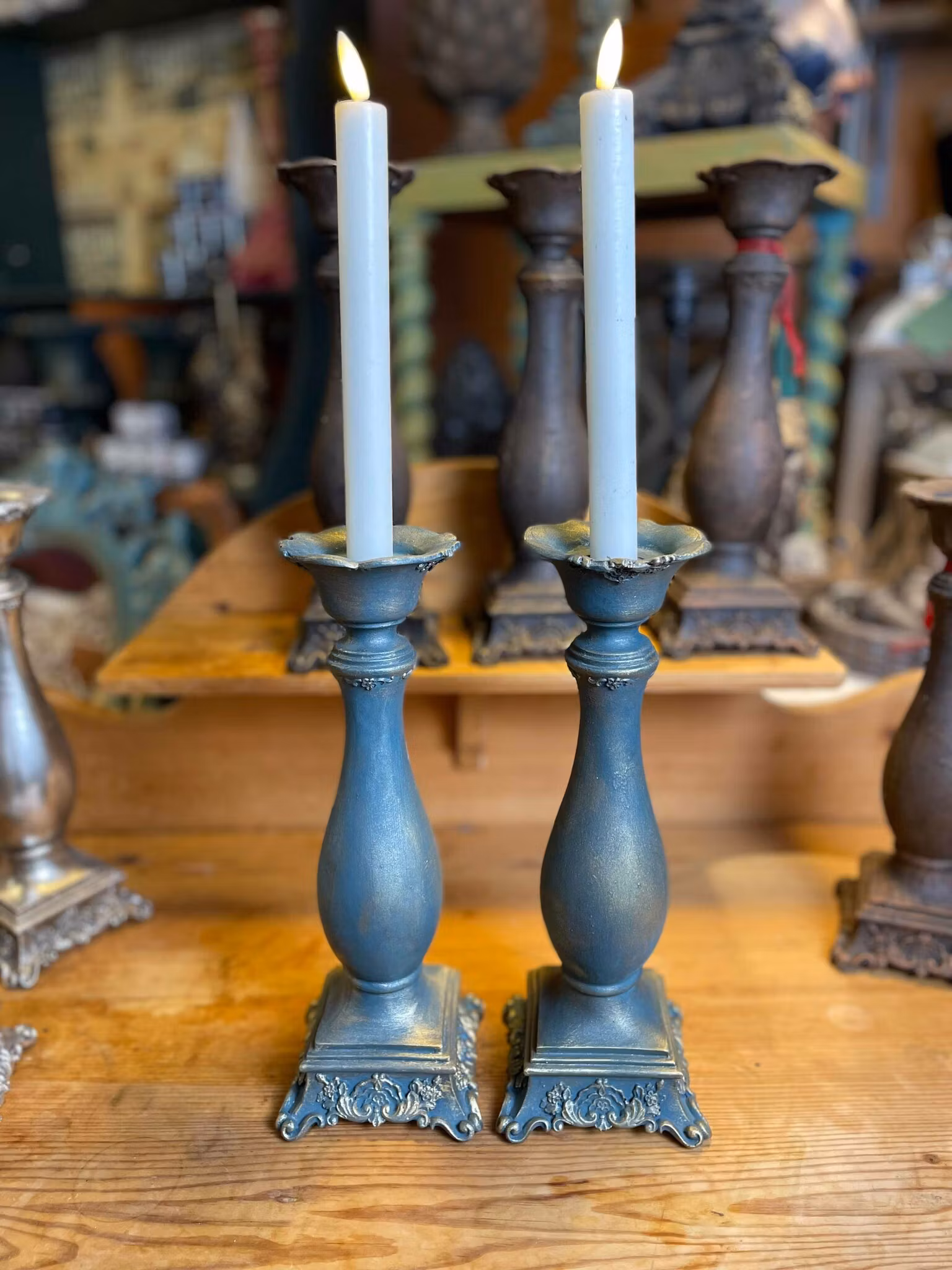 Unika, handmålade (Ej de i silver.) ljusstakar i polystone med vacker färg av rost eller petrol. 30 cm höga – en stämningsfull detalj