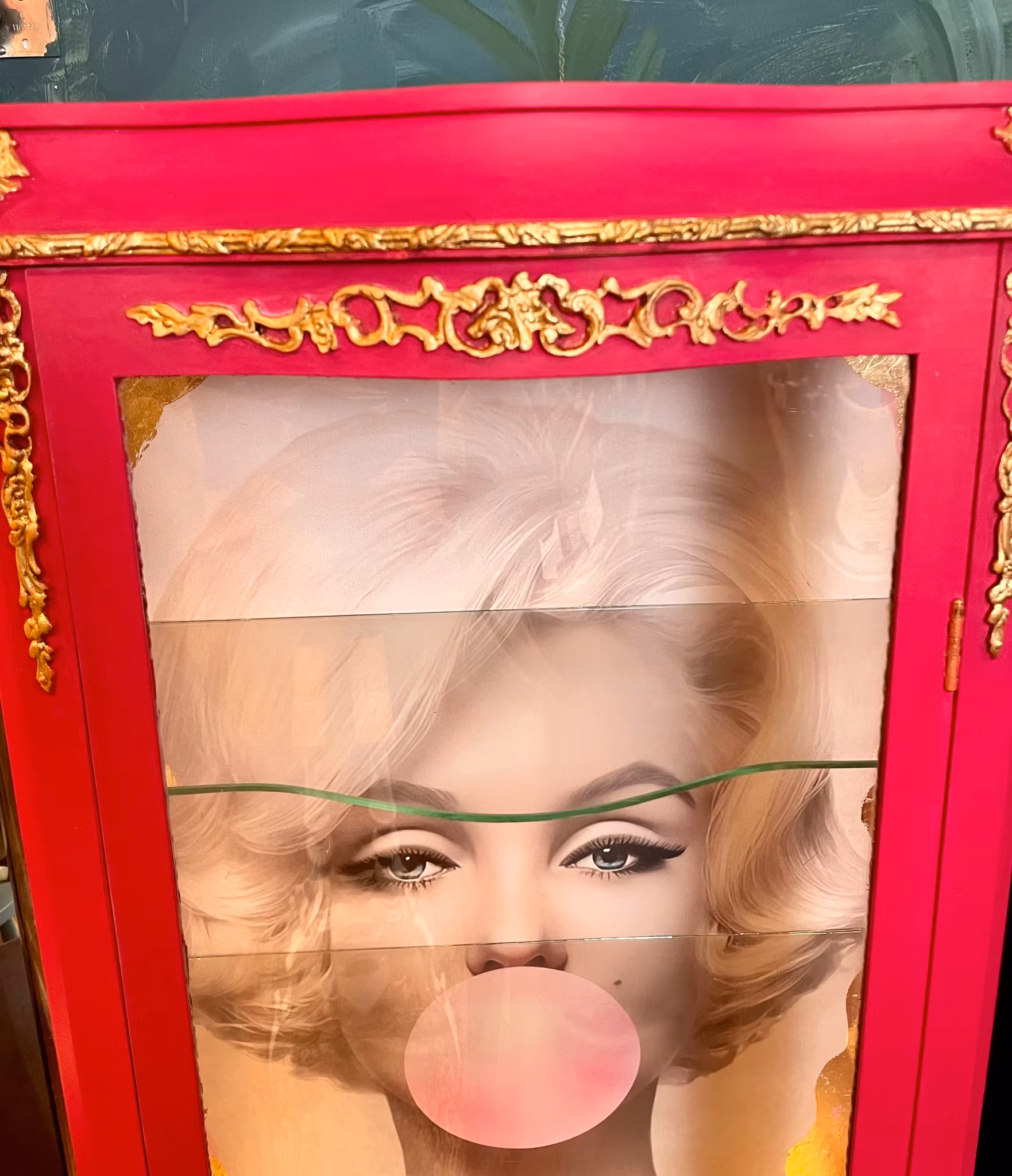 Den iögonfallande ryggen i skåpet är dekorerad med en närbild av en kvinna som påminner om Marilyn Monroe, blåser en bubbelgumbubbla. Denna konstnärliga touch ger skåpet en unik karaktär och gör det till ett samtalsämne bland dina gäster.