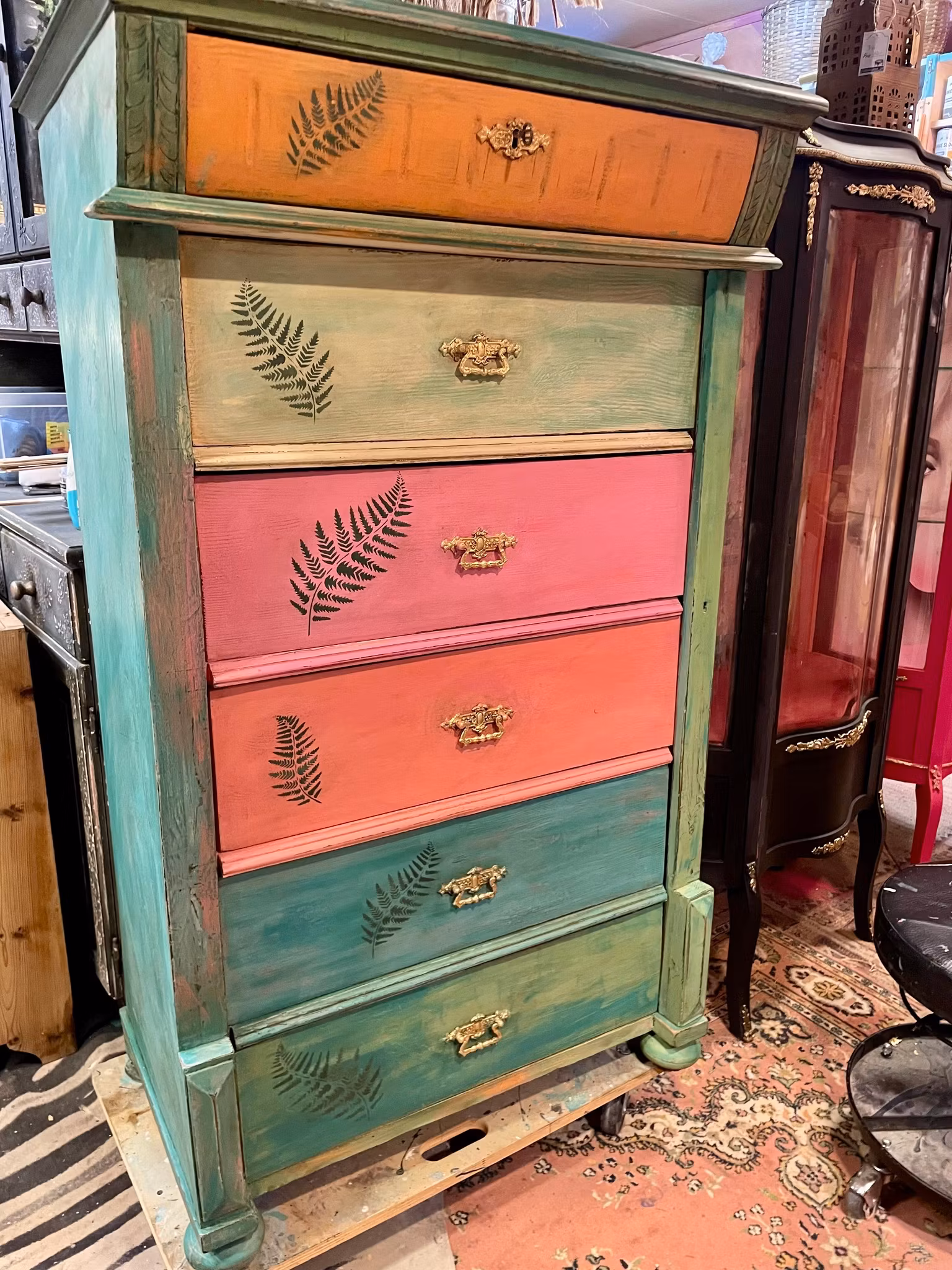 Denna vackra byrå är mer än bara ett förvaringsmöbel; det är en hyllning till konst och hantverk. Målad med omsorg av möbelkreatör Helena, har varje låda fått sin egen personlighet och charm genom användning av Annie Sloan Chalk Paint i livfulla nyanser av rosa, orange och turkos.